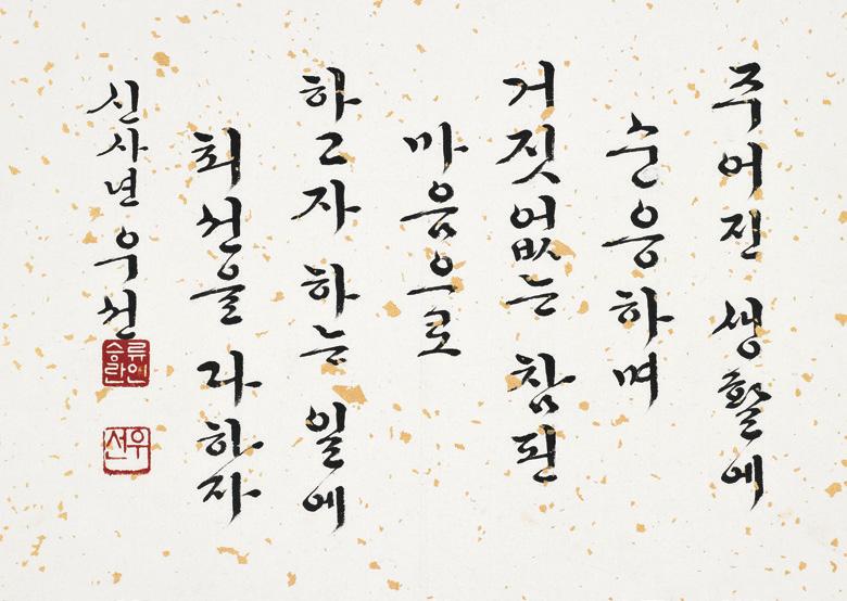 김천주 이사장은 축사에서 “서예 작품 속에는 도덕과 윤리, 고민과 예의, 그리고 철학이 담겨 있습니다. 혼란스러운 사회일수록 서예를 통해 도덕과 예의를 다시 일깨우는 것은 서예인의 큰 책임이자 보람이며, 나아가 예술의 참된 목적이라 하겠습니다. 나라의 질서와 종교, 철학을 알리고 그 뜻을 새김으로써 개인과 국민으로서의 역할을 다하도록 이끄는 것이 바로 서예의 힘입니다. 이번 전시회를 통해 그와 같은 내용을 담은 작품들이 선보일 때마다 마음이 든든하고 흐뭇하며, 사회에 던지는 교훈을 확인하게 됩니다. 그만큼 이번 전시회의 의미와 중요성을 다시 한번 강조하고 싶습니다.”라고 이번 전시의 의미를 밝히고 축하하였다.