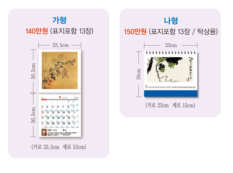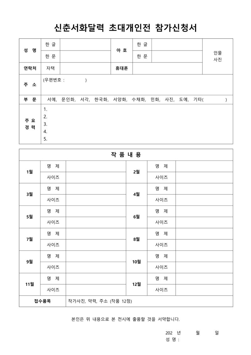 전시형태 : 달력에 실린 작품 12점 전체 전시 (표구는 본인 부담. 족자 또는 액자)
