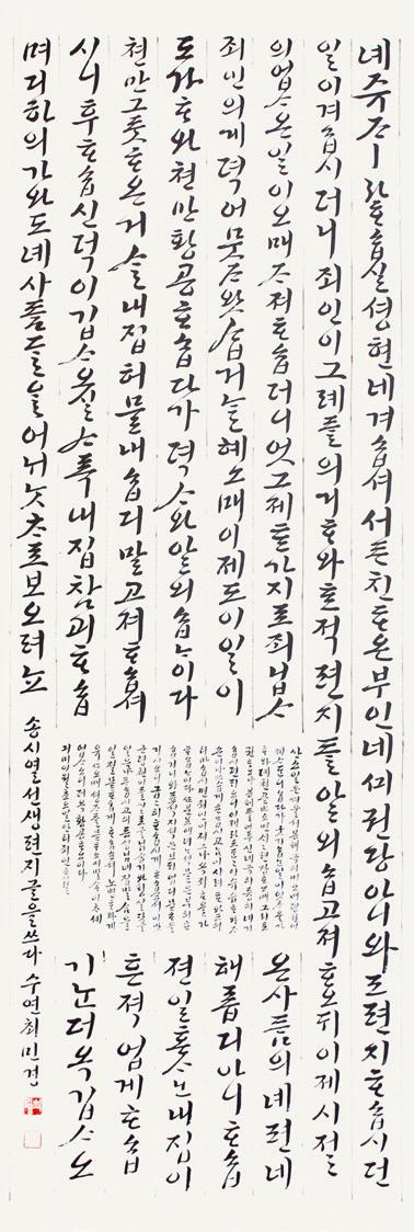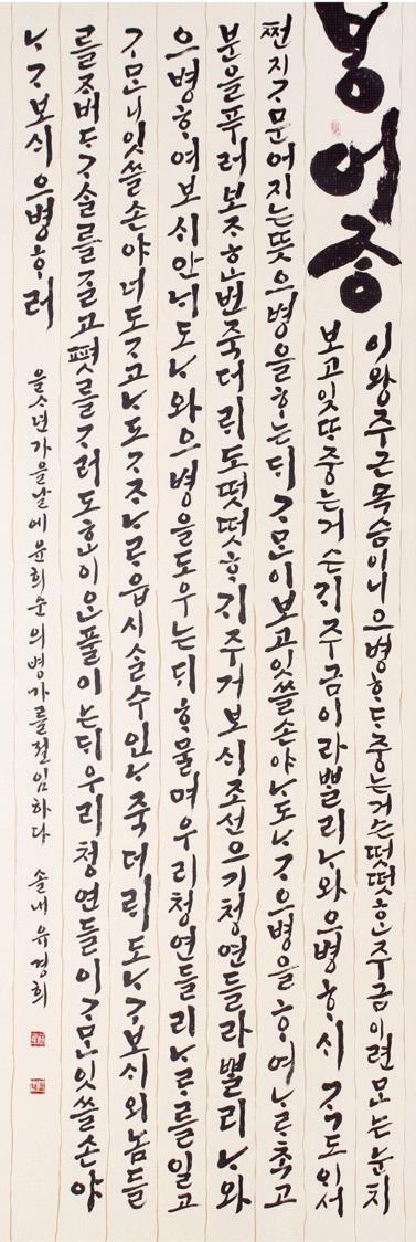 (사)한국서예협회 유경희 한글분과위원장은 인사말에서 “K문화가 세계로 뻗어가는 이 시점에 한글분과위원들은 그에 부응하기 위해 각자가 한글 서예법을 세밀하게 분석하고, 정리하고, 때로는 잘 알려지지 않은 한글 고전작품과, 민간 소설, 가사집, 편지글, 이러한 것들 중 좀 더 향토적이고 서민적인 민간소설 필사를 집중 조명해 보고 그것들을 작품으로 전달해 보고자 노력하였습니다.”라고 밝히면서 이번 전시를 준비하는 과정을 밝혀주었다.