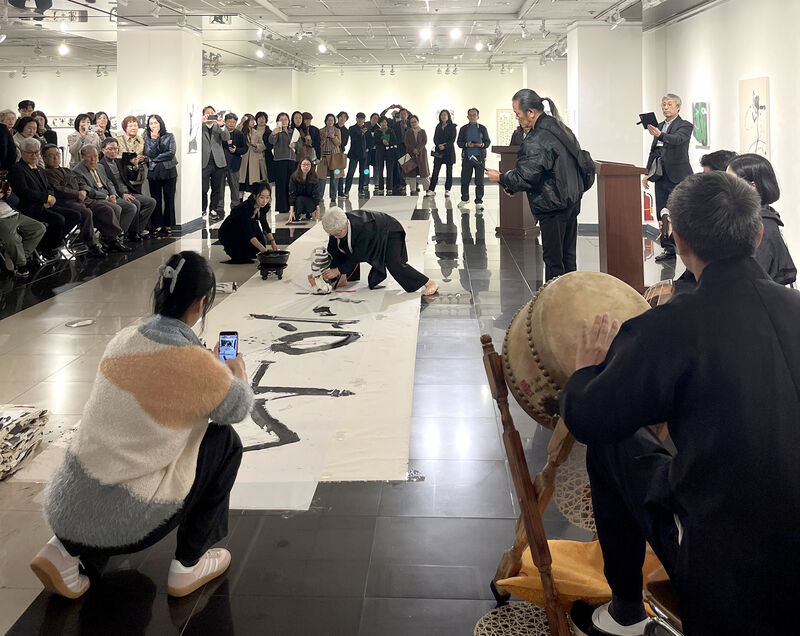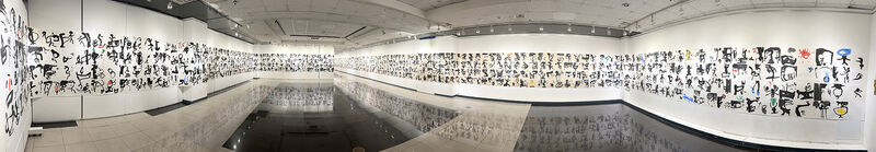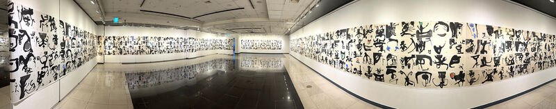 이번 개인전에 주목할 작품은 <천자문>(그림3)으로 100미터에 달하는 대작이다. “2021년 코로나로 전 세계가 펜데믹pandemic의 혼돈 속에 있을 때, 나 역시 고립된 시간 속에서 자신을 돌아보는 시간을 갖게 됐다. 그동안 서예의 현대성 문제에 고민했고 천자문을 나만의 미감으로 풀어야겠다고 생각했다. 2021년 3월 21일에 붓을 들기 시작해 4字를 한 작품으로 더 나아가 8字를 한 작품으로 연결 지어 가면서 현대서예 천자문 작업의 긴 여정旅程에 나서게 되었고 4년에 걸쳐 100여 미터의 대작을 완성하게 됐다.”라고 했다. 지금까지 천자문 작품은 오체로 표현하는 데 머물러 있었는데 그는 그동안 고민해 왔던 현대적 미감을 드러내는 조형의 실험을 통해 공간의 변화를 추구하고 있다는 점이다.