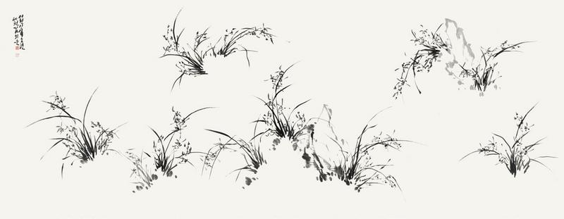 고결함과 은일(隱逸)을 상징하는 난초 작품 가운데 전지 다섯 장 연폭의 묵란 작품 <난초Ⅱ>는 오랜 수련을 통해 얻은 정련된 필선이 돋보였다. 하나하나 독립된 난초를 하나로 담아 장쾌하게 연출하였다. 담묵과 농묵의 변화로 입체감을 확보하였고, 원근 배치로 율동감을 부여하였다.