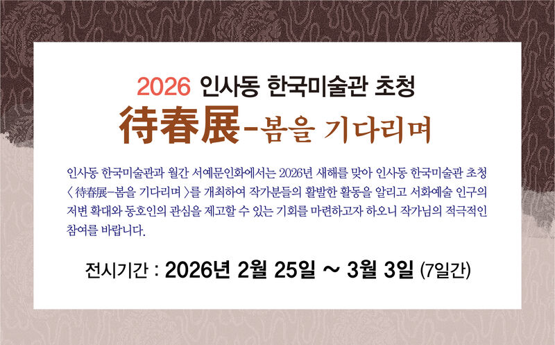 인사동 한국미술관과 월간 서예문인화에서는 2026년 새해를 맞아 인사동 한국미술관 초청 < 待春展-봄을 기다리며 >를 개최하여 작가분들의 활발한 활동을 알리고 서화예술 인구의 저변 확대와 동호인의 관심을 제고할 수 있는 기회를 마련하고자 하오니 작가님의 적극적인 참여를 바랍니다.