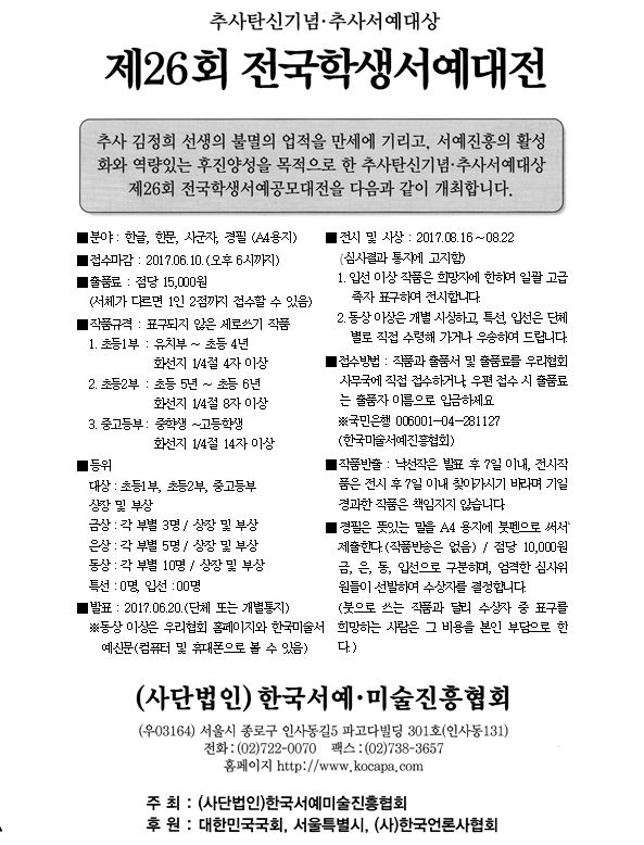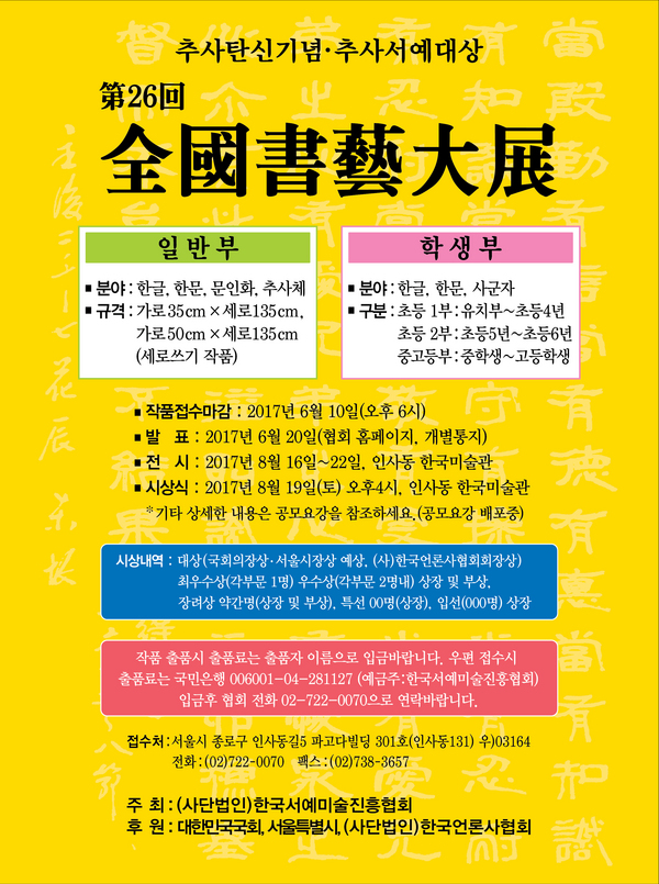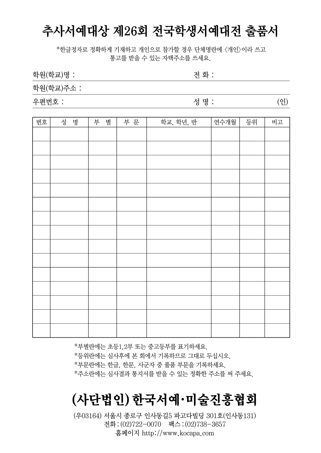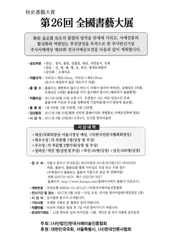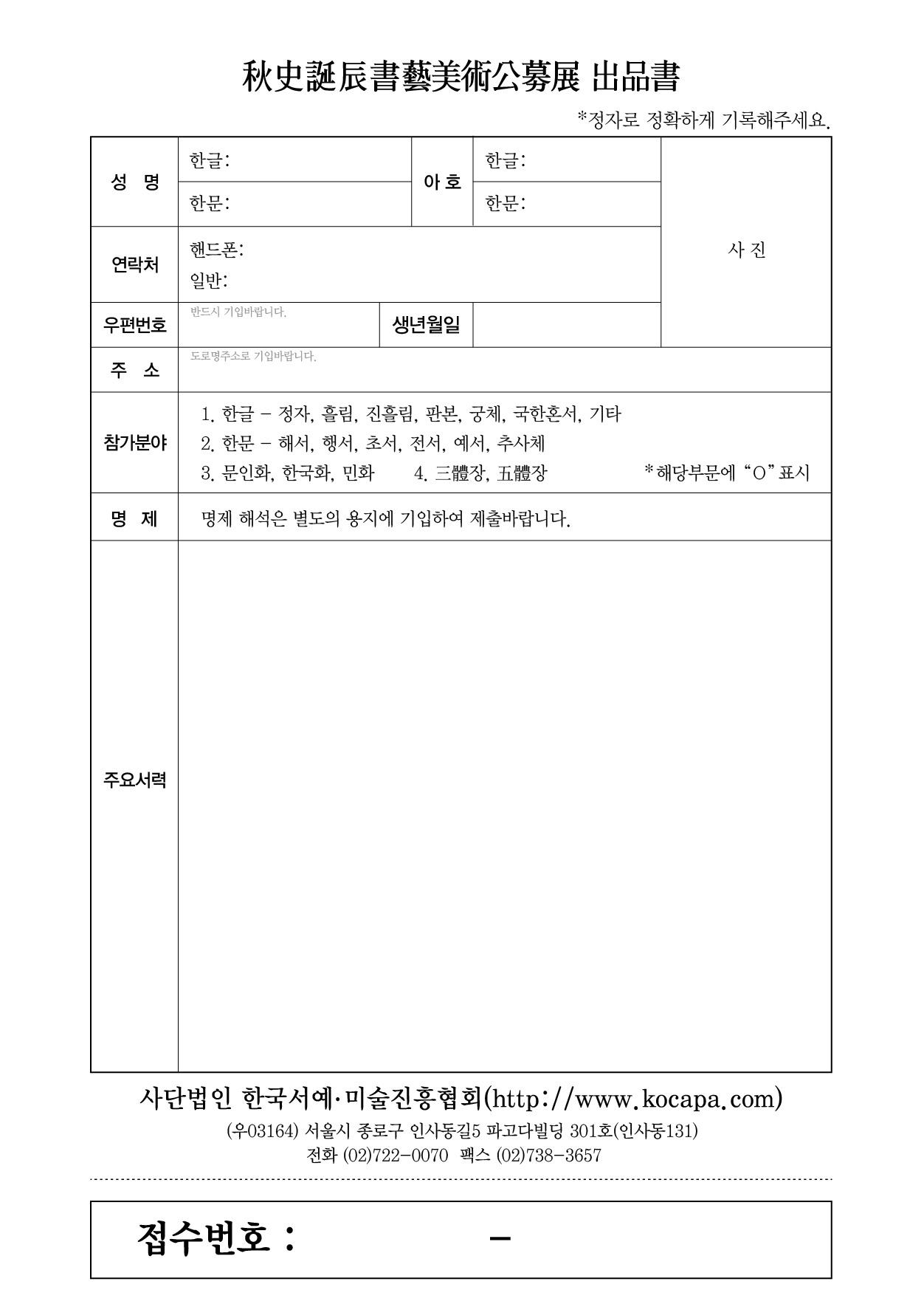 문자/카톡 홍보(유료서비스)서예/문인화/민화/서각/캘리그라피/한국화/전각/미술 분야협회전, 공모전, 초대전, 전시회 등문자/카톡 홍보를 이용해보세요.서예/미술 협회 회원 및 초대작가 등 많은 회원들에게 빠른 홍보가 가능합니다.- 단문(SMS) : 한글 45자(90byte)- 장문(LMS) : 한글 1,000자(2000byte)- 포토문자(MMS) : 사진3장 + 한글 1000자(2000byte)- 카...