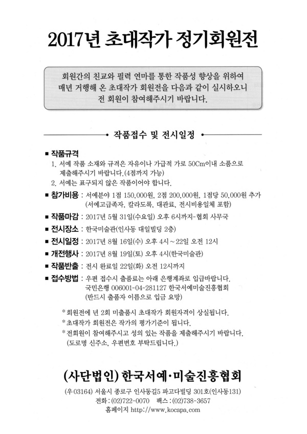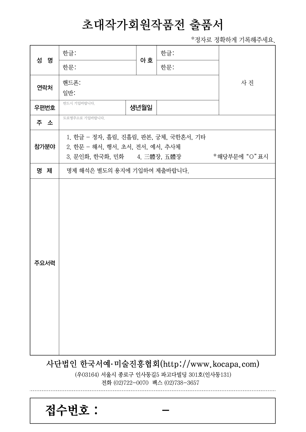 문자/카톡 홍보(유료서비스)서예/문인화/민화/서각/캘리그라피/한국화/전각/미술 분야협회전, 공모전, 초대전, 전시회 등문자/카톡 홍보를 이용해보세요.서예/미술 협회 회원 및 초대작가 등 많은 회원들에게 빠른 홍보가 가능합니다.- 단문(SMS) : 한글 45자(90byte)- 장문(LMS) : 한글 1,000자(2000byte)- 포토문자(MMS) : 사진3장 + 한글 1000자(2000byte)- 카...