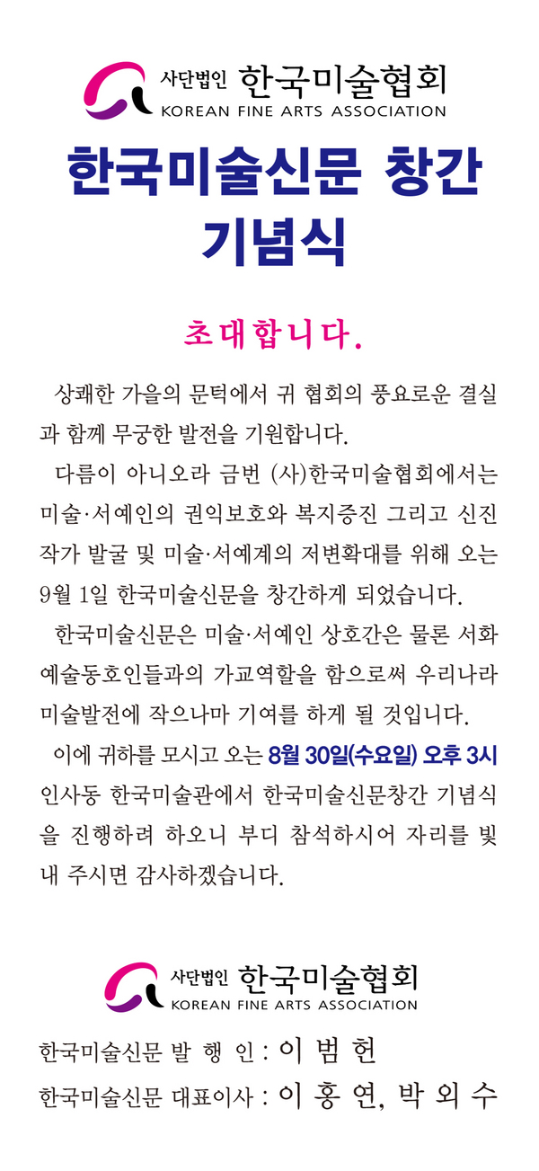 문자/카톡 홍보(유료서비스)서예/문인화/민화/서각/캘리그라피/한국화/전각/미술 분야협회전, 공모전, 초대전, 전시회 등문자/카톡 홍보를 이용해보세요.서예/미술 협회 회원 및 초대작가 등 많은 회원들에게 빠른 홍보가 가능합니다.- 단문(SMS) : 한글 45자(90byte)- 장문(LMS) : 한글 1,000자(2000byte)- 포토문자(MMS) : 사진3장 + 한글 1000자(2000byte)- 카...