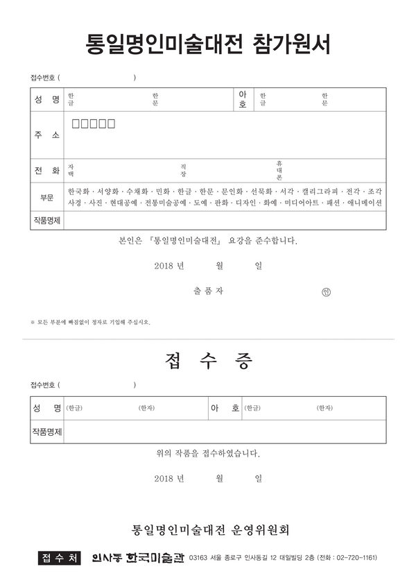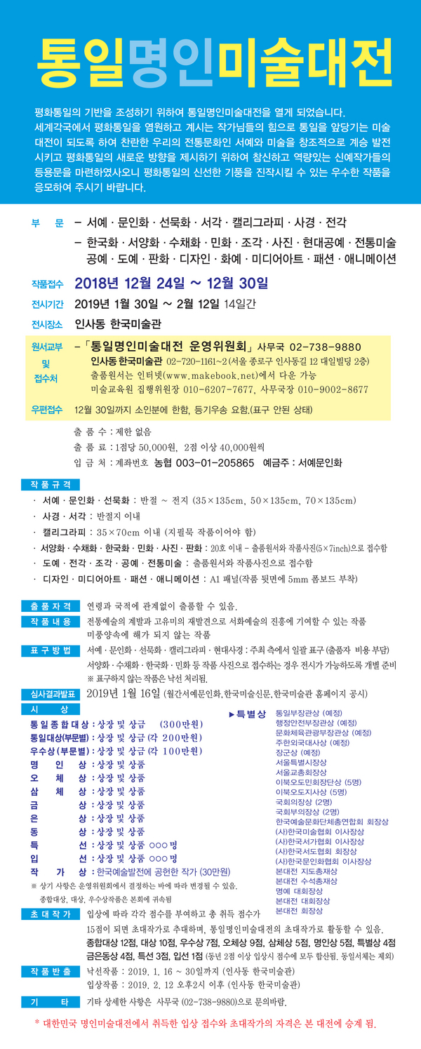 평화통일의 기반을 조성하기 위하여 <통일명인미술대전>을 개최합니다.