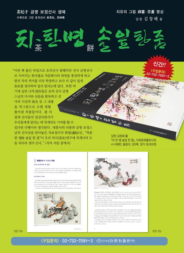 『차茶 한 병餠 솔 잎 한 줌』이란 선적(禪的)이면서도 정감어린 책에서는 우리나라 차의 역사를 알게 해주고, 초의선사와 범해 각안선사에서 금명 보정선사로 이어지는 다선일미(茶禪一味)의 ‘차 살림살이’가 한눈에 들어온다. 나아가 불학(佛學)과 선(禪)을 차와 시로 녹여낸 금명선사의 다시(茶詩)를 소재 삼아 그린 다화(茶畵)들이나, 다신전(茶神傳)과 동다송(東茶松)의 내용을 형상화한 다화(茶畵)들은 두고두고 감상할만한 유일무이한 작품들이 되리라고 믿는다.