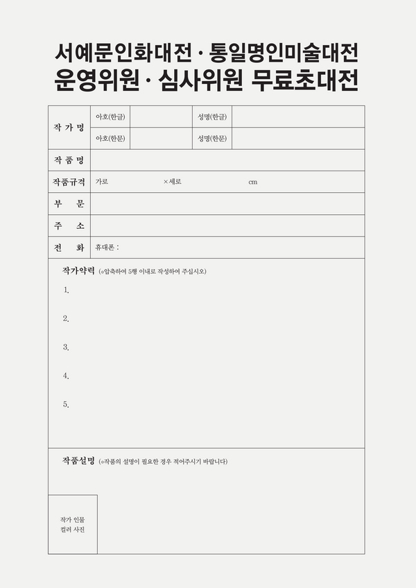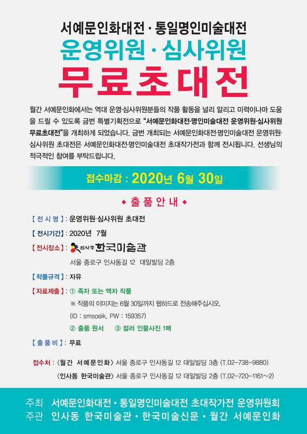 월간 서예문인화에서는 역대 운영·심사위원분들의 작품 활동을 널리 알리고 미력이나마 도움을 드릴 수 있도록 금번 특별기획전으로 서예문인화대전·명인미술대전 운영위원·심사위원무료초대전을 개최하게 되었습니다. 금번 개최되는 서예문인화대전·명인미술대전 운영위원·심사위원 초대전은 서예문인화대전·명인미술대전 초대작가전과 함께 전시됩니다. 선생님의 적극적인 참여를 부탁드립니다.