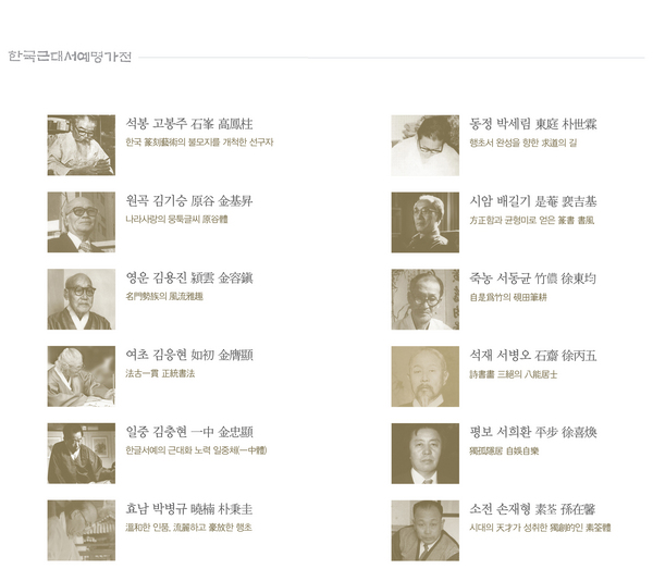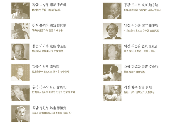 석봉 고봉주 / 원곡 김기승 / 영운 김용진 / 여초 김응현 / 일중 김충현 /