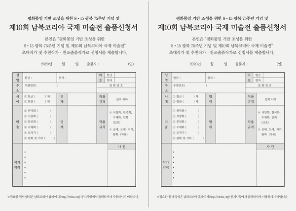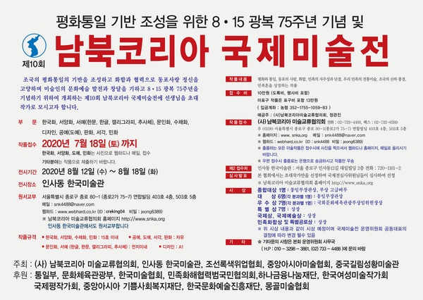 조국의 평화통일의 기반을 조성하고 화합과 협력으로 동포사랑 정신을 고양하며 미술인의 문화예술 발전과 창달을 기하고 8·15 광복 75주년을 기념하기 위하여 개최하는 제10회 남북코리아 국제미술전에 선생님을 초대작가로 모시고자 합니다.