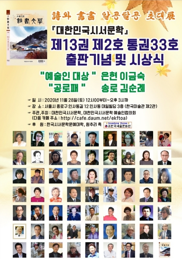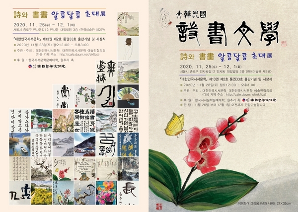 『大韓民國詩書文學』문예지는 코로나19로 인하여 마음조이며 우여곡절 끝에 드디어 훌륭한 문인들을 모시고 2020년 하반기 제13권 제2호 통권33호 「詩와 書畫 알콩달콩 초대」展을 환희 밝힙니다.