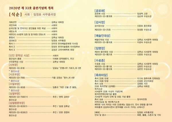 앞으로도 『大韓民國詩書文學』의 발전을 기약하고, 아끼고 사랑해 주시기를 희망합니다. 끝으로 33호를 위하여 고생하신 특별운영진, 시서문학 카페 모든 정회원님께도 감사 인사 올립니다. 더불어 곱게 제본하여 단장된 본 시서문학 33호를 맞이하여 소중하게 빛난 이 자리를 빌어서 본지 애독자이신 문우 여러분과 함께 이 기쁨을 영원히 간직하고자 합니다.