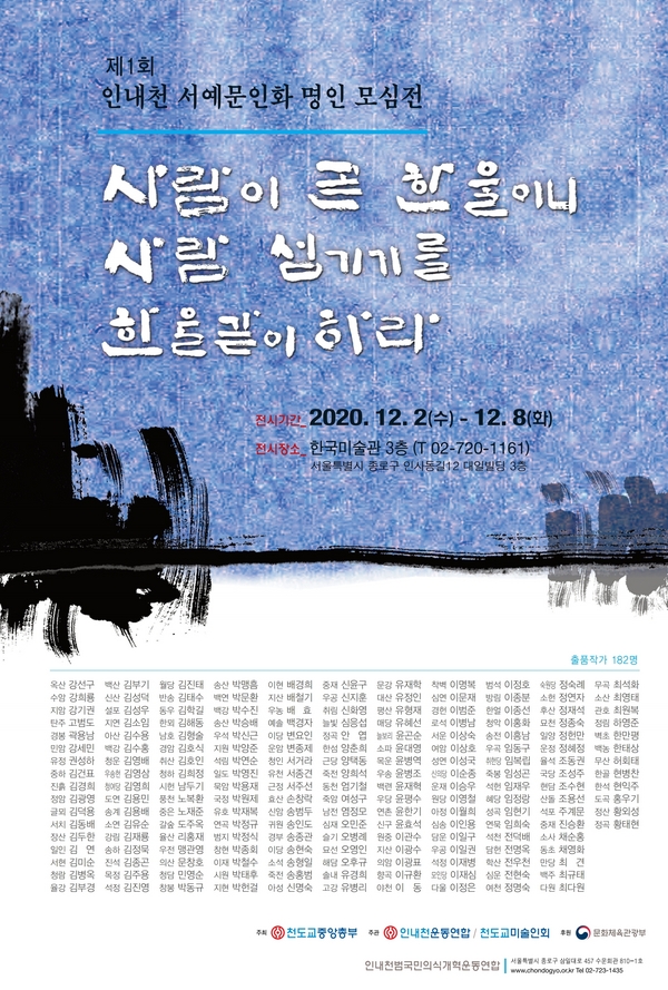 끝으로 이번 전시회를 위해 정성을 다해주신 천도교미술인회 염정모 회장님과 인내천운동연합의 변종제 위원장님을 비롯한 관계자 여러분, 그리고 전시회를 후원해주신 문화체육관광부 박양우 장관 님께 깊은 감사의 뜻을 전합니다.