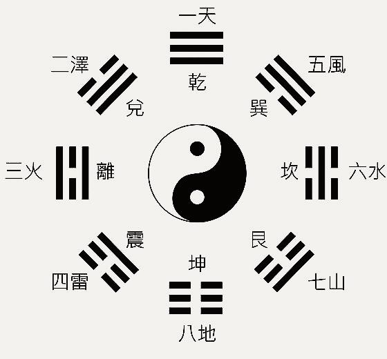 중국 민족의 시조라 전해지는 상고시대(上古時代) 복희씨(伏羲氏)**가 팔괘를 만들어 백성을 다스렸다는 설(說)이다. 예를 들면 감(坎)괘는 세로로 세우면 ‘水’자가 되고, 리(离)괘는 세로로 세우면 ‘火’자가 되고, 곤(坤)괘는 세로로 세우면 川자가 된다는 것이다.