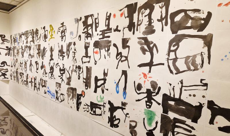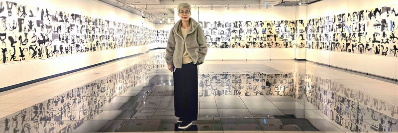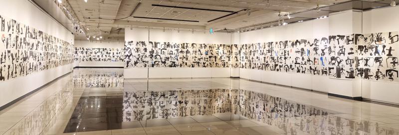 이번 개인전에 주목할 작품은 <천자문>(그림3)으로 100미터에 달하는 대작이다. “2021년 코로나로 전 세계가 펜데믹pandemic의 혼돈 속에 있을 때, 나 역시 고립된 시간 속에서 자신을 돌아보는 시간을 갖게 됐다. 그동안 서예의 현대성 문제에 고민했고 천자문을 나만의 미감으로 풀어야겠다고 생각했다. 2021년 3월 21일에 붓을 들기 시작해 4字를 한 작품으로 더 나아가 8字를 한 작품으로 연결 지어 가면서 현대서예 천자문 작업의 긴 여정旅程에 나서게 되었고 4년에 걸쳐 100여 미터의 대작을 완성하게 됐다.”라고 했다. 지금까지 천자문 작품은 오체로 표현하는 데 머물러 있었는데 그는 그동안 고민해 왔던 현대적 미감을 드러내는 조형의 실험을 통해 공간의 변화를 추구하고 있다는 점이다.